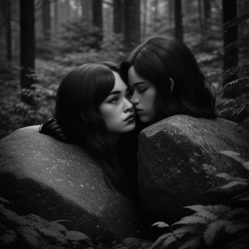 This image shows two young women sharing a kiss in a forest, concealed behind a large rock. The scene is rendered in a film noir style, using high contrast photography and dramatic shadows.