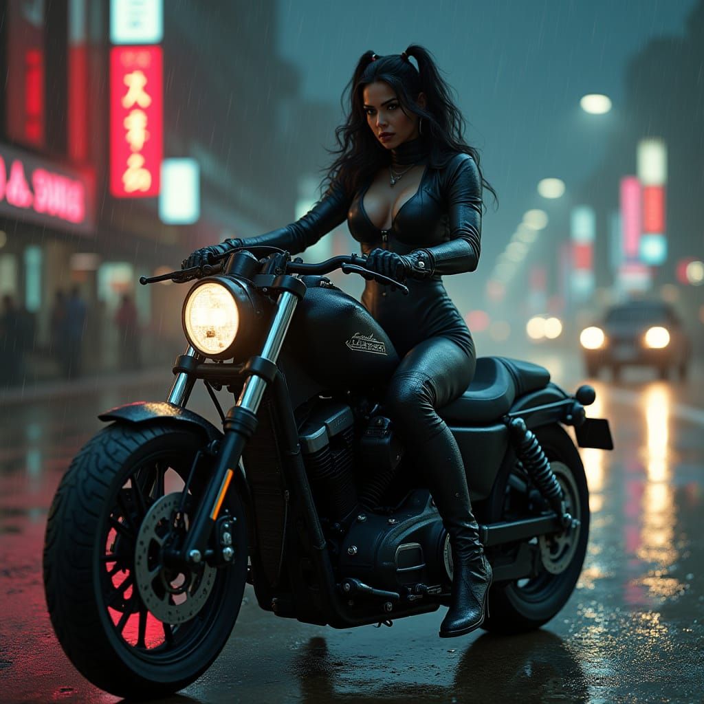 This image captures a dramatic moment of a female biker in a gritty, dystopian world, evoking a sense of foreboding with her intense gaze and raised gun, set against a dark, neon-lit backdrop with sharp lines and dramatic shading.