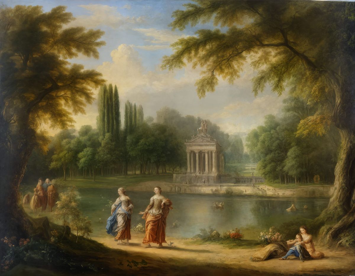 A landscape painting of the Versailles palace gardens in the style of old masters. The oil on canvas work evokes a classical aesthetic.