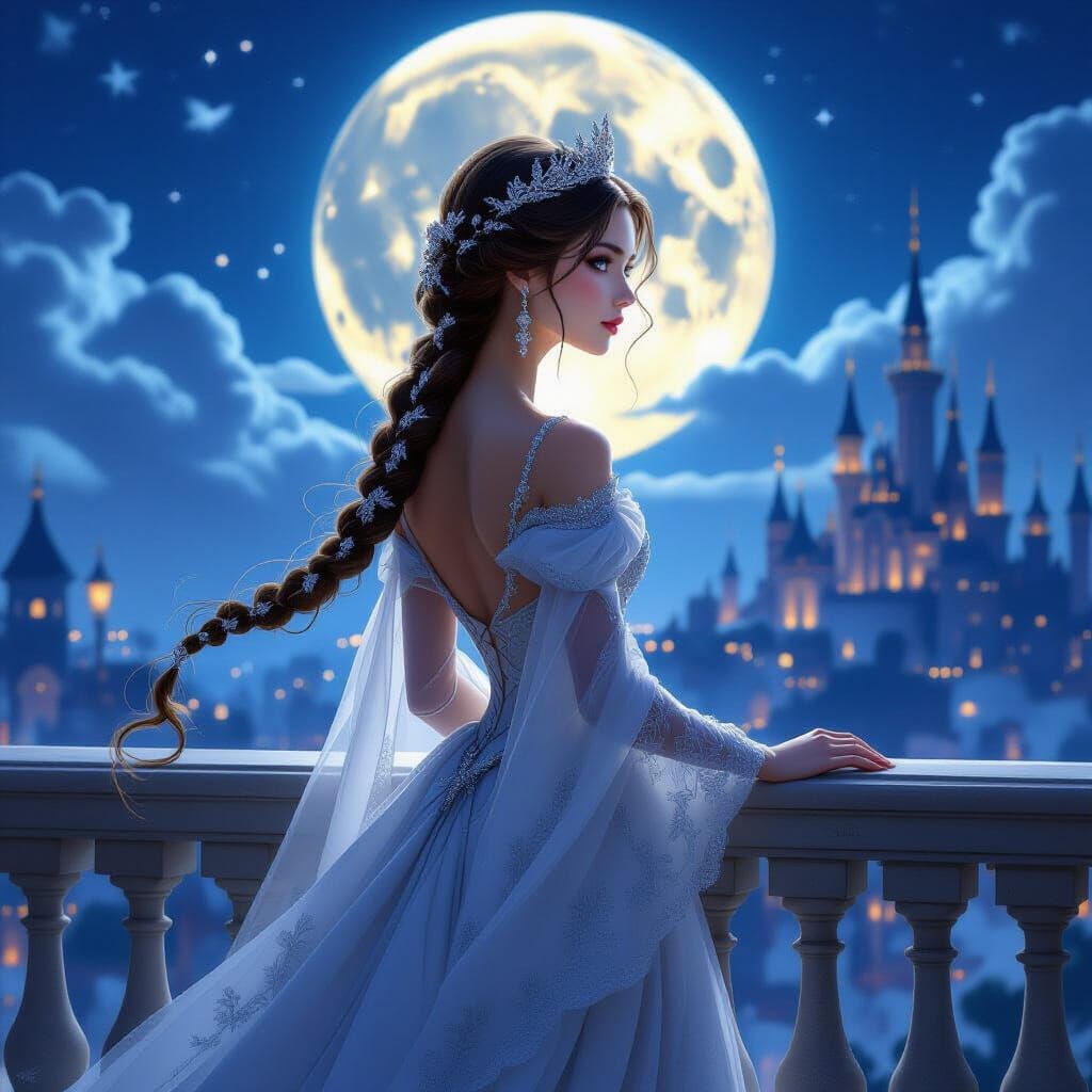 This image shows a regal princess with jeweled, braided hair on a balcony overlooking a moonlit, fantastical city. Rendered in a romantic, hyperdetailed fantasy concept art style with vivid, dreamlike colors.