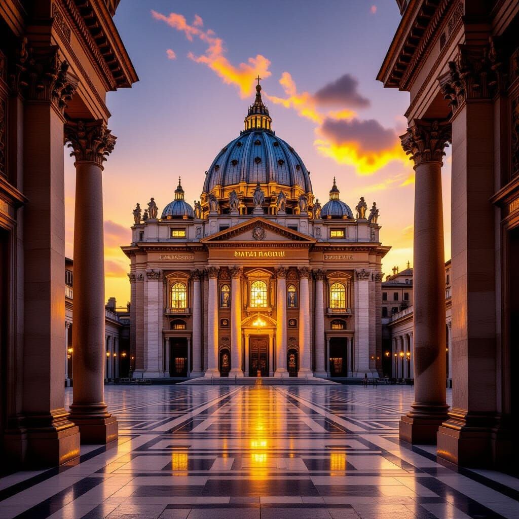 This image captures the Basilica di San Paolo fuori le mura at sunset, showcasing its detailed classical architecture. The golden hour light highlights ornate stonework and stained glass, creating a tranquil atmosphere. Photographed with a wide-angle lens.