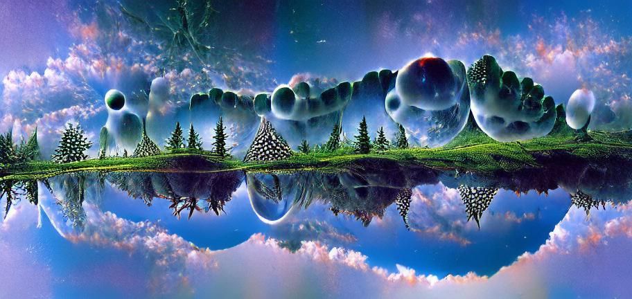 A mirrored forest landscape reflecting a cosmic scene above. This symmetrical image captures a playful interplay of macrocosm and microcosm with realistic textures and vibrant details.