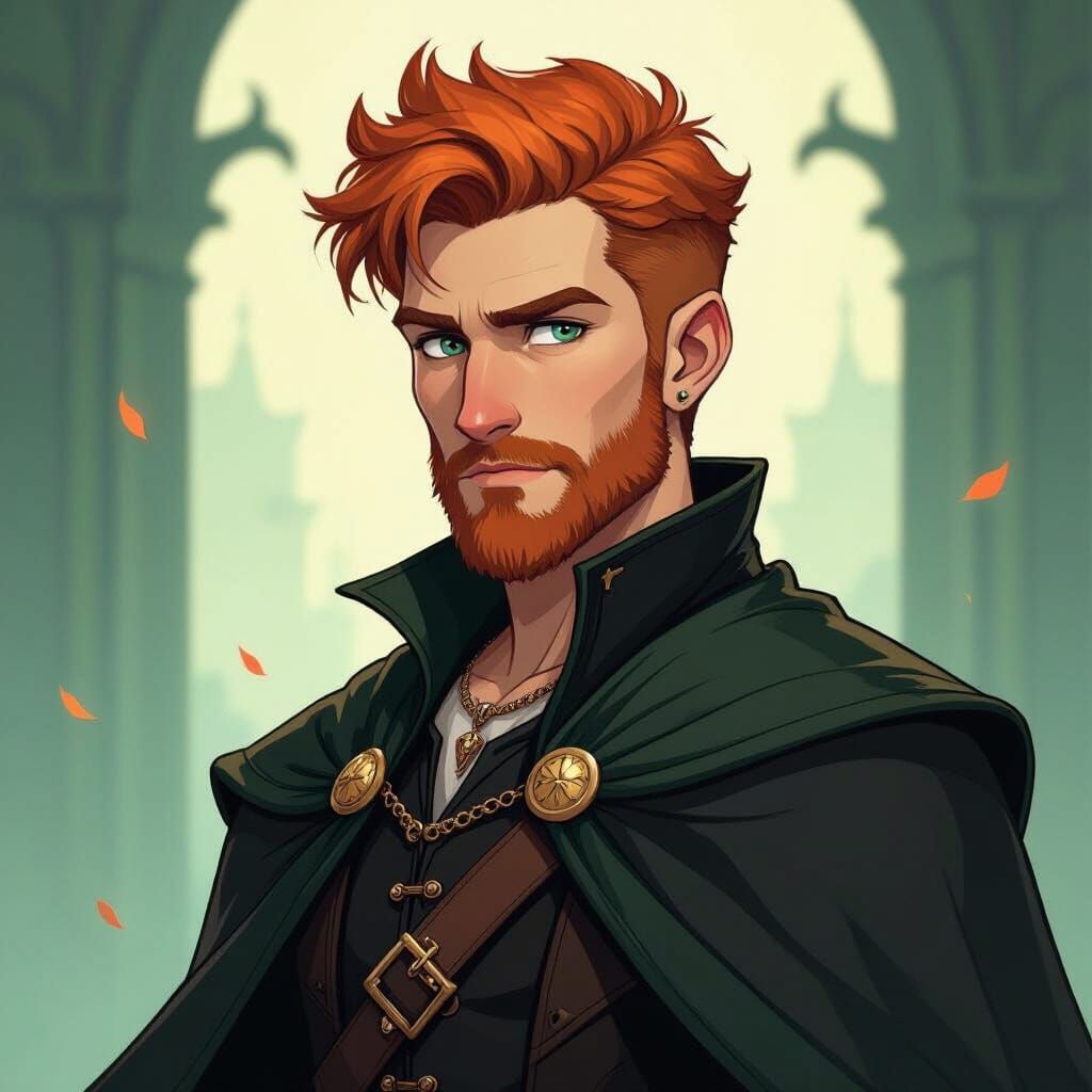 This image features a red-haired male bard with short hair and a beard, wearing black and dark green. Rendered in a bold, exaggerated cartoon style with dramatic lighting.