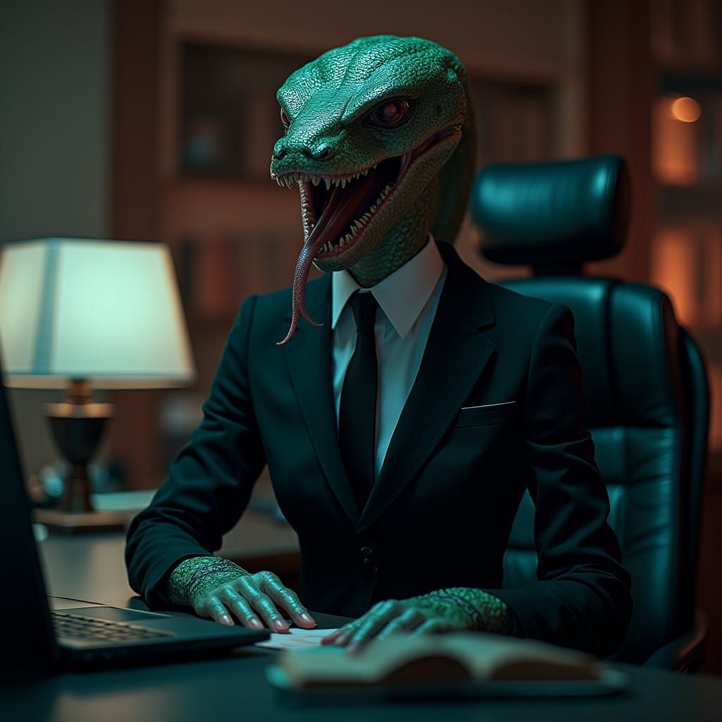 This image shows a mysterious secretary with a serpent-like appearance, surrounded by the dark, mystical atmosphere of a dimly lit office, blending elements of horror and fantasy art