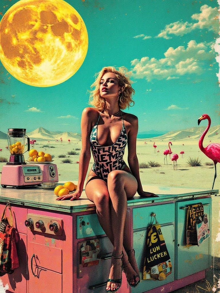 A vivid image of a woman in a swimsuit on a retro kitchen island, lemons beside her. Set in a surreal desert under a glowing moon, this high contrast image blends chaotic, hand-drawn elements in a raw, energetic style.
