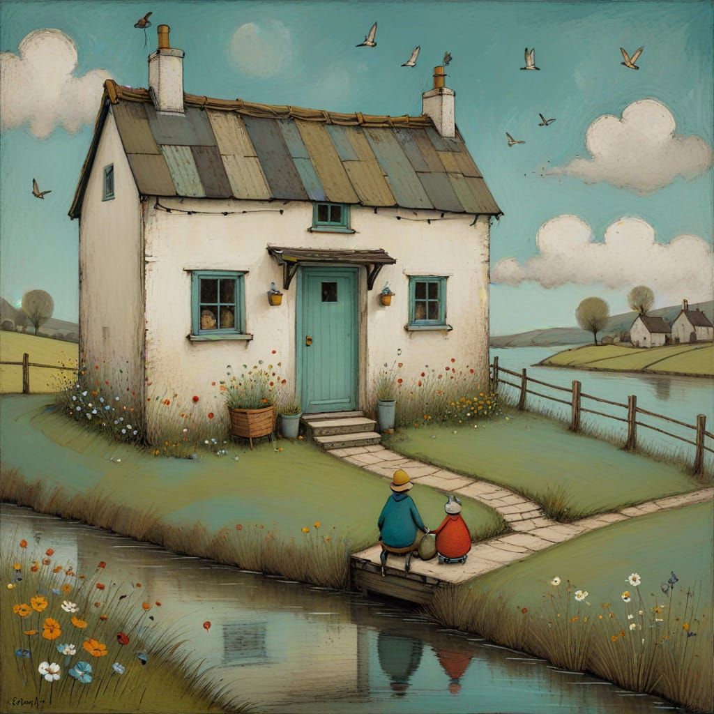 This image depicts a serene cottage scene in a quirky, idyllic setting, evoking feelings of calmness and relaxation.