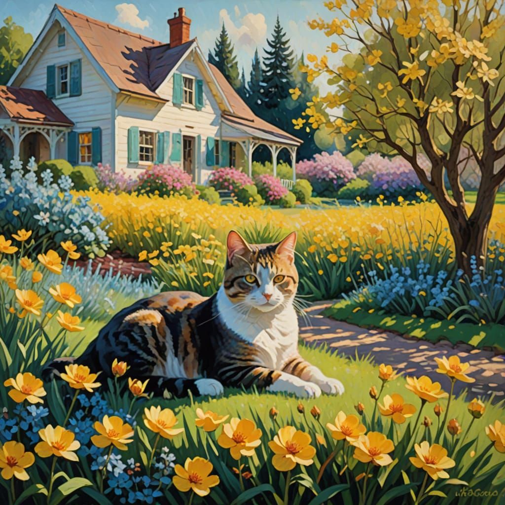 This idyllic image captures a serene cat amidst vibrant spring flowers in a lush garden, set against a charming white cottage with soft brushstrokes and warm sunlight filtering through the blossoms in a golden hour scene.