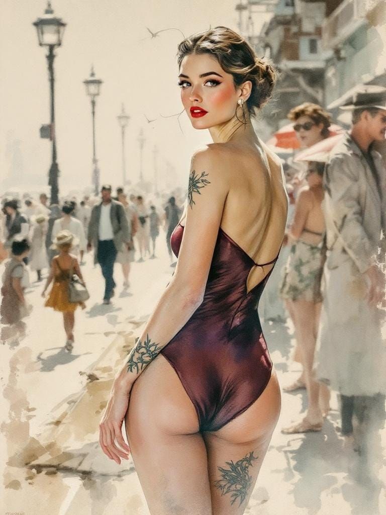 A vintage portrait of a 1950s pin-up woman at the beach. The watercolor art features soft atmospheric perspective and delicate ink linework, reminiscent of classic travel art.