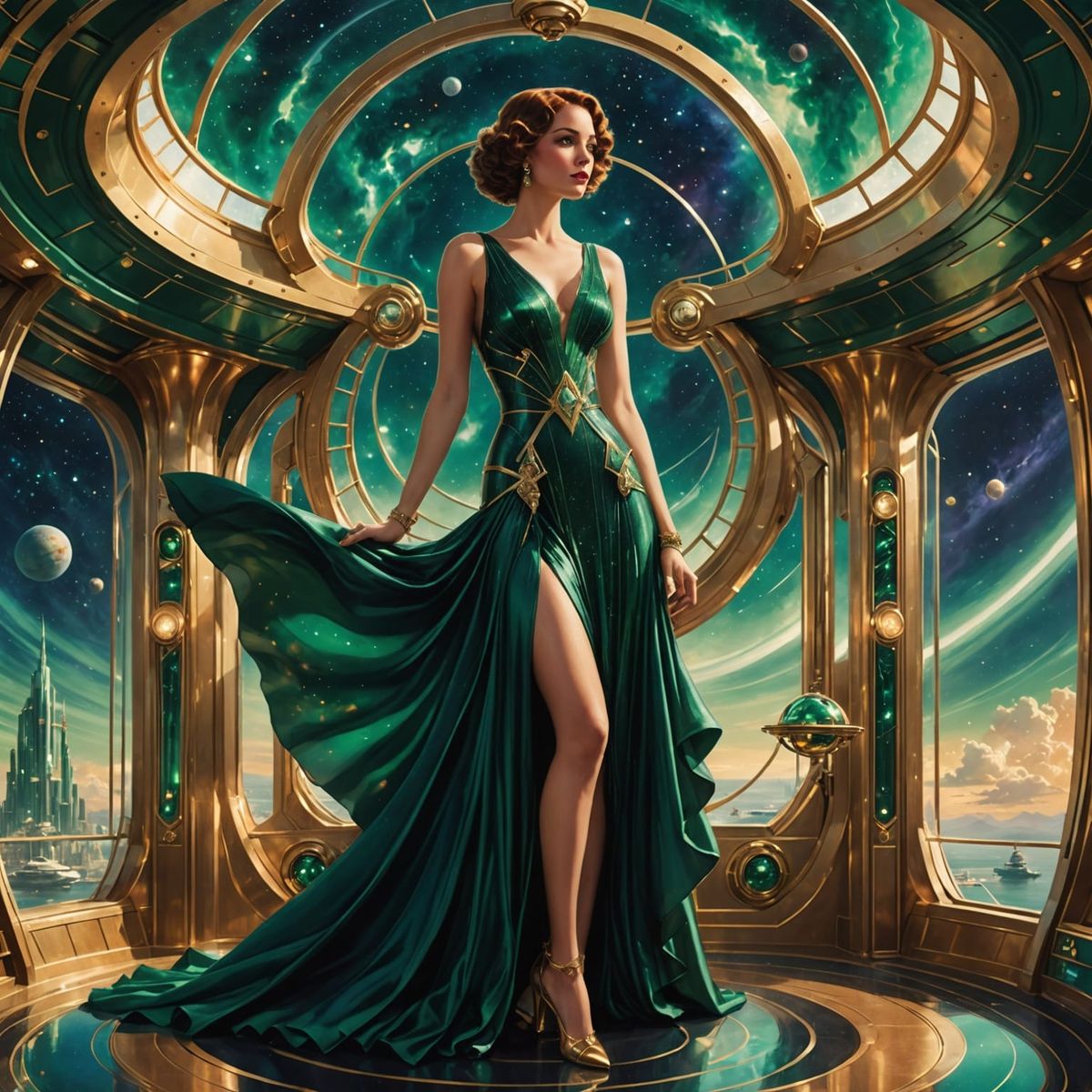 A woman in a vintage dress on a grand Art Deco spaceship observation deck. Below, a nebula swirls in emerald and gold. The interior gleams with chrome and brass, illuminated by starlight. Classic sci-fi book cover aesthetic.