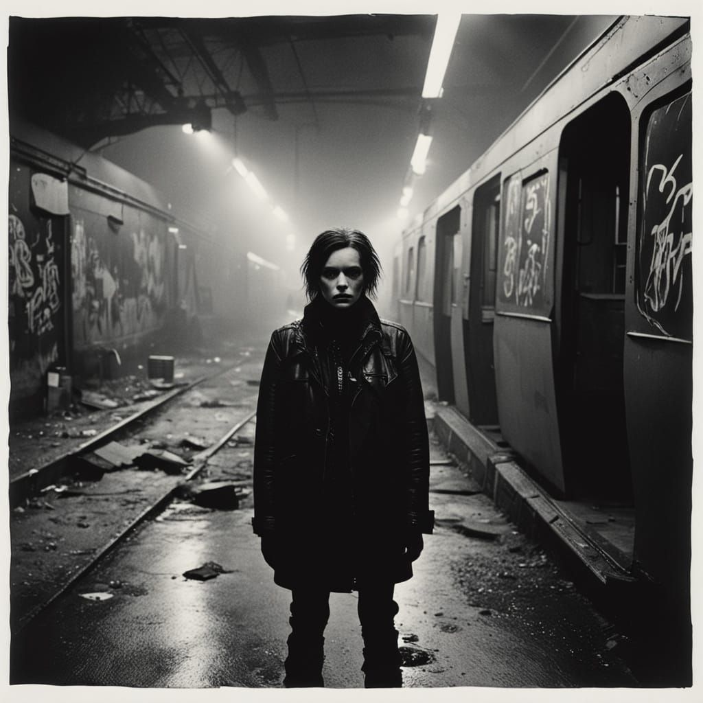 This image shows a goth model in a subway, rendered in high-contrast black and white. Neon lights illuminate the scene, with fog and smoke adding to the moody, cinematic atmosphere in a film noir aesthetic.