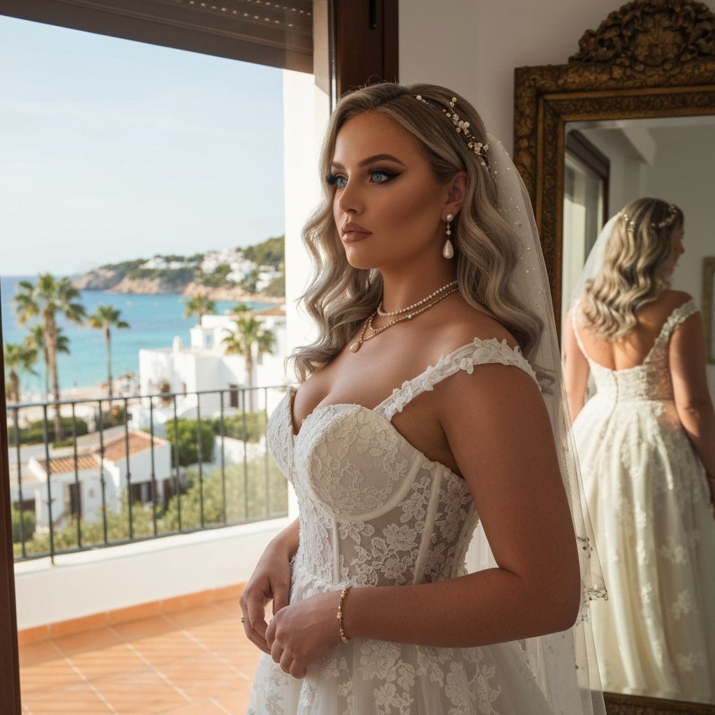 This image shows a beautiful young woman in a wedding dress, standing in a sunlit Ibiza bedroom. The gown accentuates her figure, while the mirror reflects her silhouette against the stunning coastal backdrop.