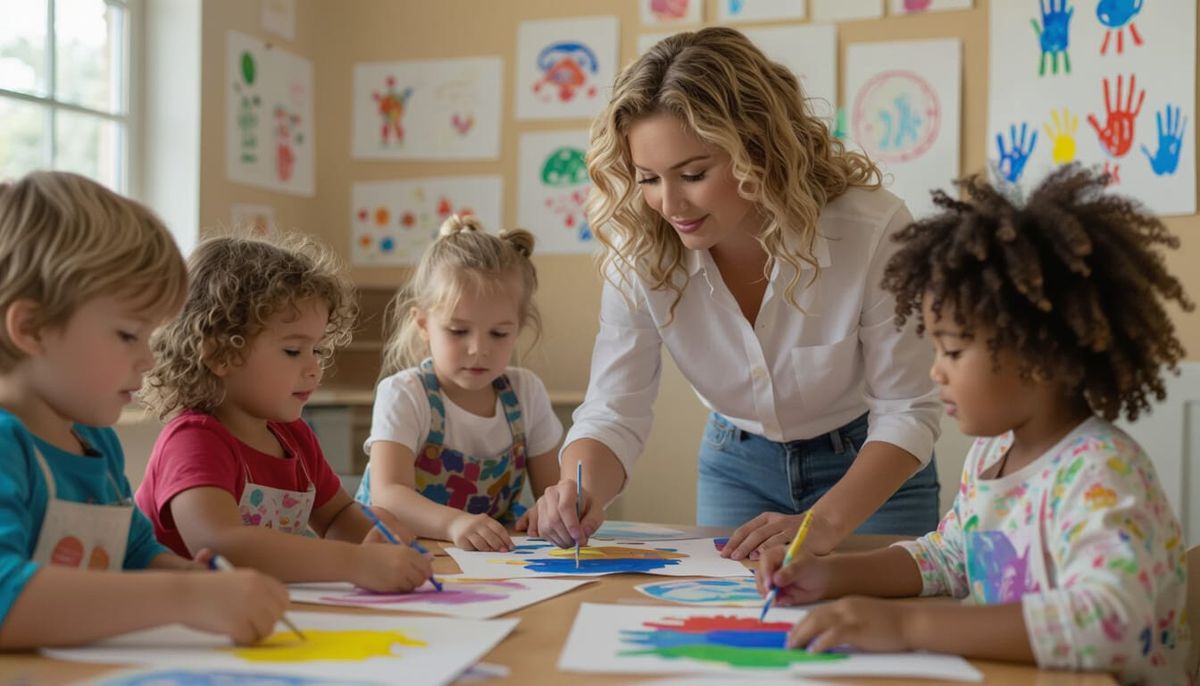 This image shows six preschoolers finger-painting in a bright, cheerful classroom. A teacher with paint-splattered clothes hangs artwork on the wall, creating a lively, playful atmosphere.