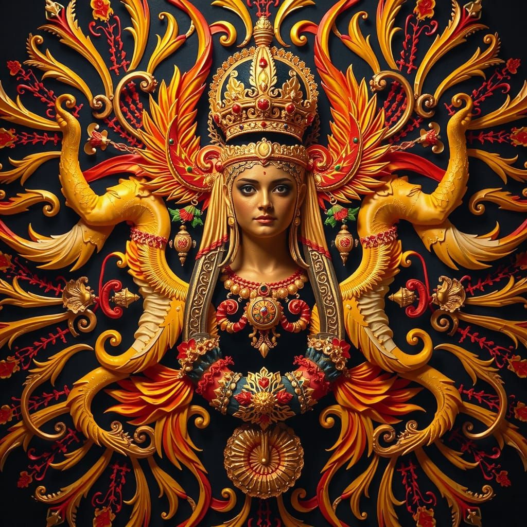 This hyperrealistic image showcases a masterful composition with vivid red, green, and yellow against dark black and bright white. It features sculptural elements and sharp details, embodying beauty and truth.