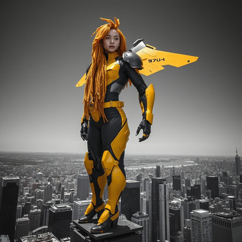 a full body shot black and white photo of a Japanese girl with yellow dreadlocks wearing a puce and yellow colour block mech armour suit with huge mech wings. standing on top of a huge future skyscraper in a dark brutalist style. puce colour sky. Professional photography, bokeh, natural lighting, canon ...