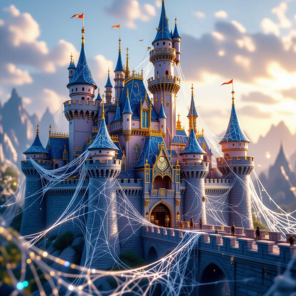 This hyperrealistic fantasy image depicts a majestic castle constructed entirely of shimmering spiderwebs, adorned with dew. Iridescent colors and cinematic lighting highlight its delicate, ephemeral structure.