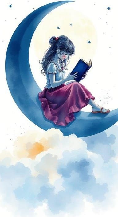 This image shows a girl on a moon-shaped bed reading a book. The scene is lit by cool moonlight, with splash art textures and gritty stars creating a watercolor digital painting.