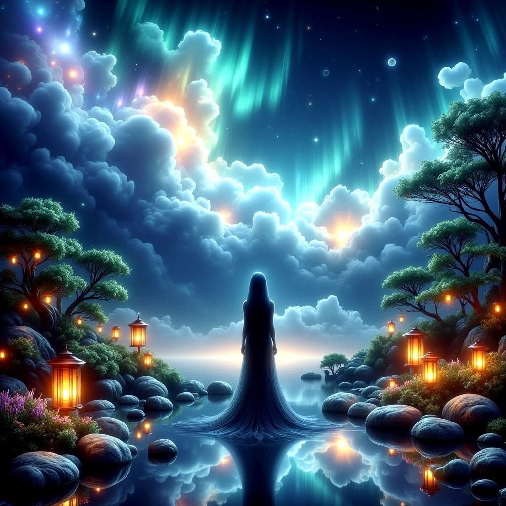 A striking picture of a woman in a Japanese garden gazing at a starry night. The image is highly detailed and evokes a dreamy, ethereal aesthetic.