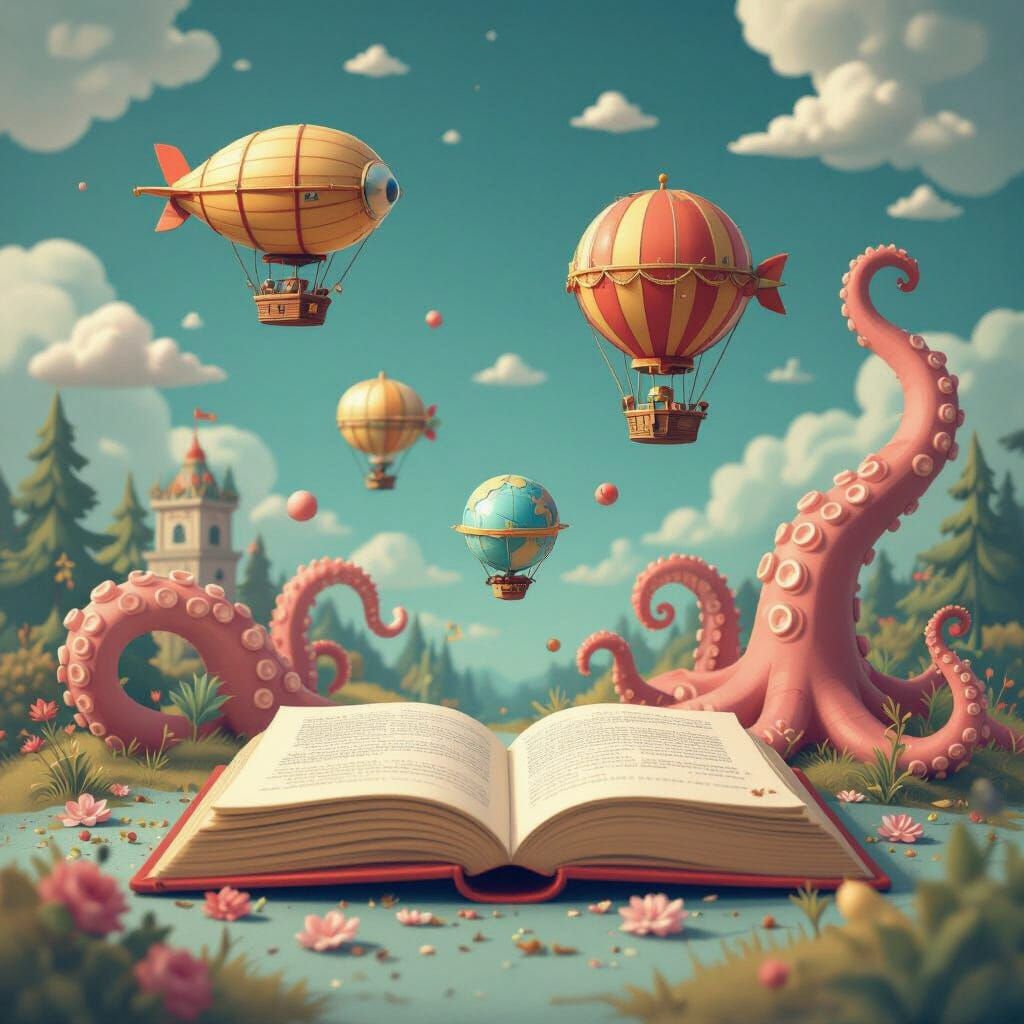 This image features a storybook opening with tiny whimsical icons like airships and globes, rendered in a soft retro color palette. Detailed fantasy concept art with deep colors.