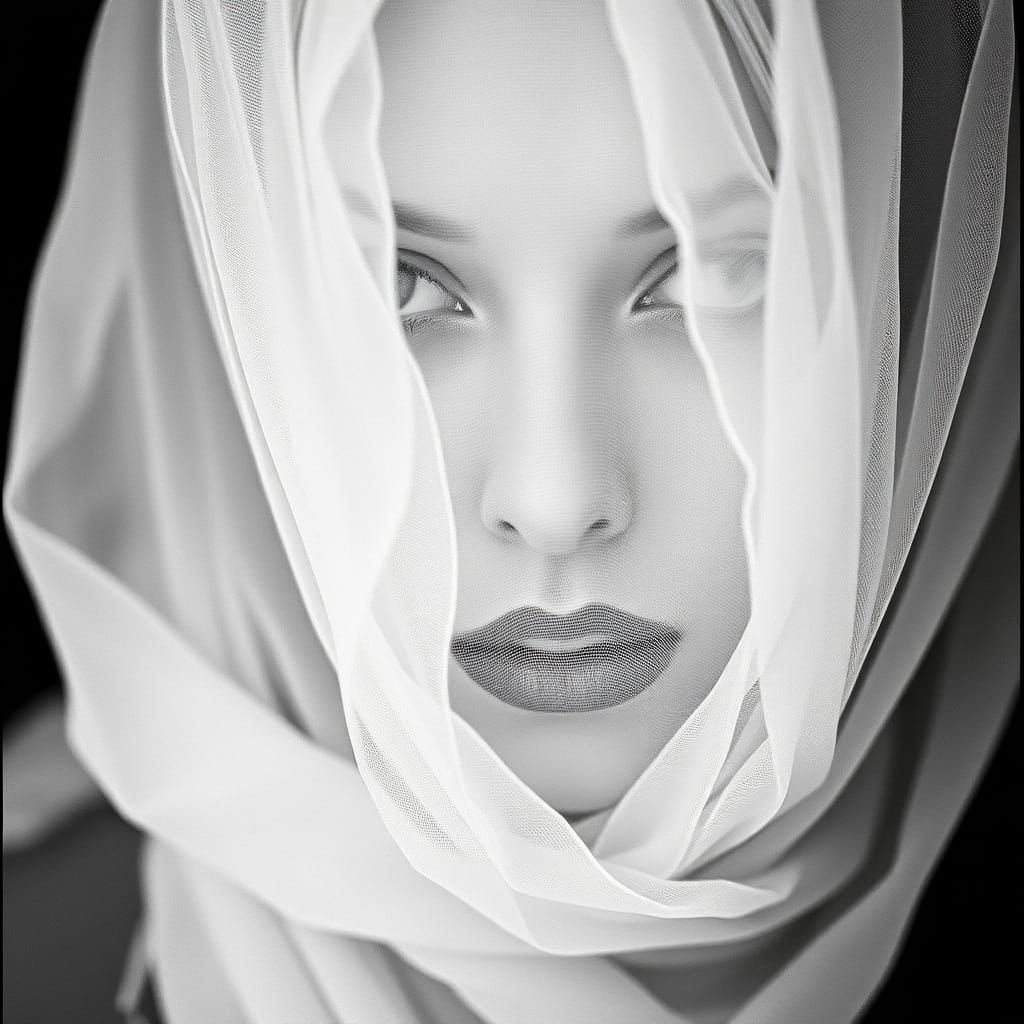 This image shows a blonde woman's face in a dramatic close-up, covered by a sheer white veil. The black and white image has high contrast, noticeable film grain and dramatic lighting, in a cinematic aesthetic.