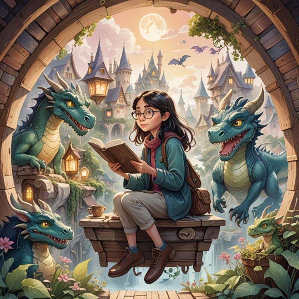 This enchanting watercolor illustration depicts a young girl with glasses and dark hair discovering a hidden portal in her grandmother's attic, leading to a fantastical world of floating islands and friendly dragons, set against a warm and inviting background.