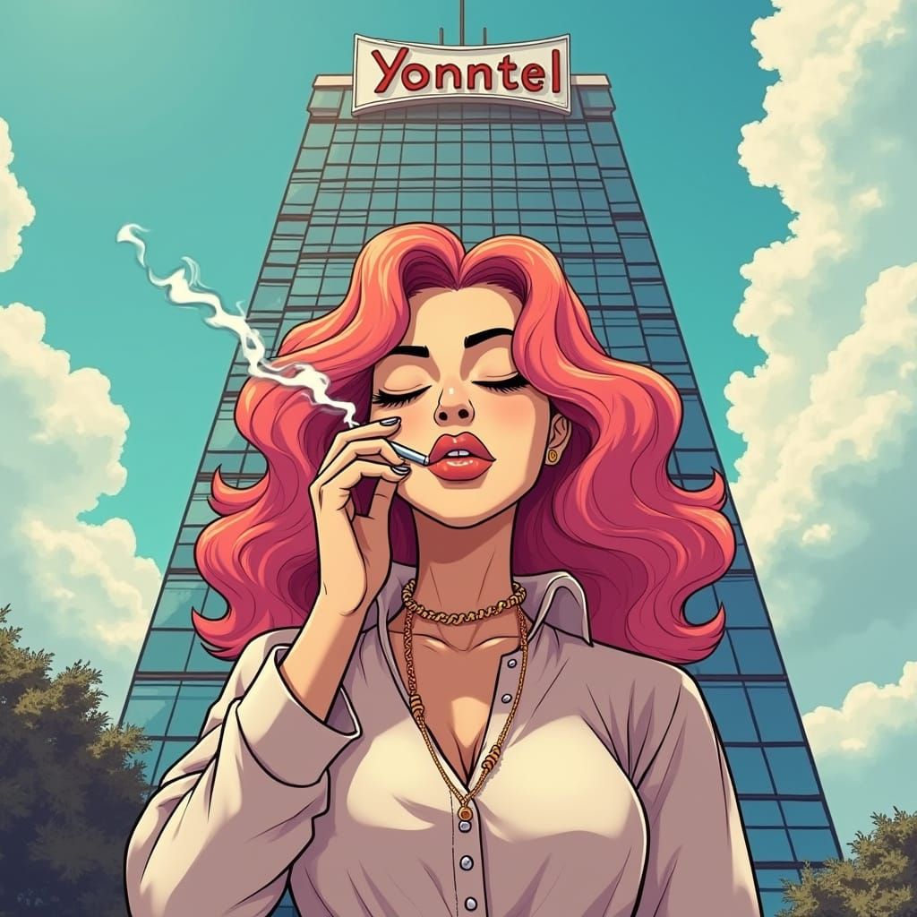 A vibrant anime-style image of a Dominican girl smoking. She has pink and orange curly hair and wears designer clothes, set against a backdrop of a tower building. The aesthetic features bold lines and pastel colors.