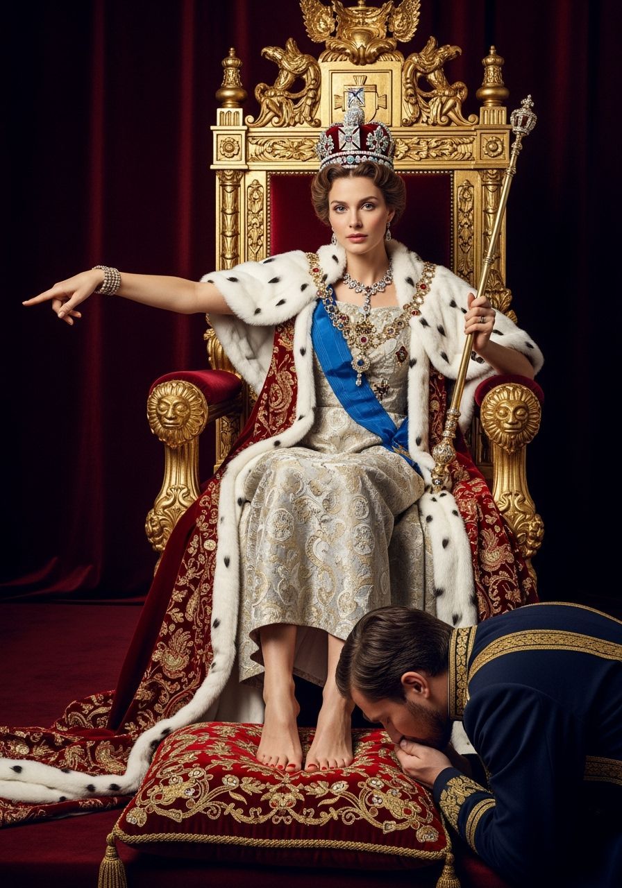 A majestic Russian Tsarina is depicted sitting barefoot on a gold throne. This striking image features coronation robes, fine jewelry, and a kneeling courtier, captured with natural lighting and shallow depth of field.