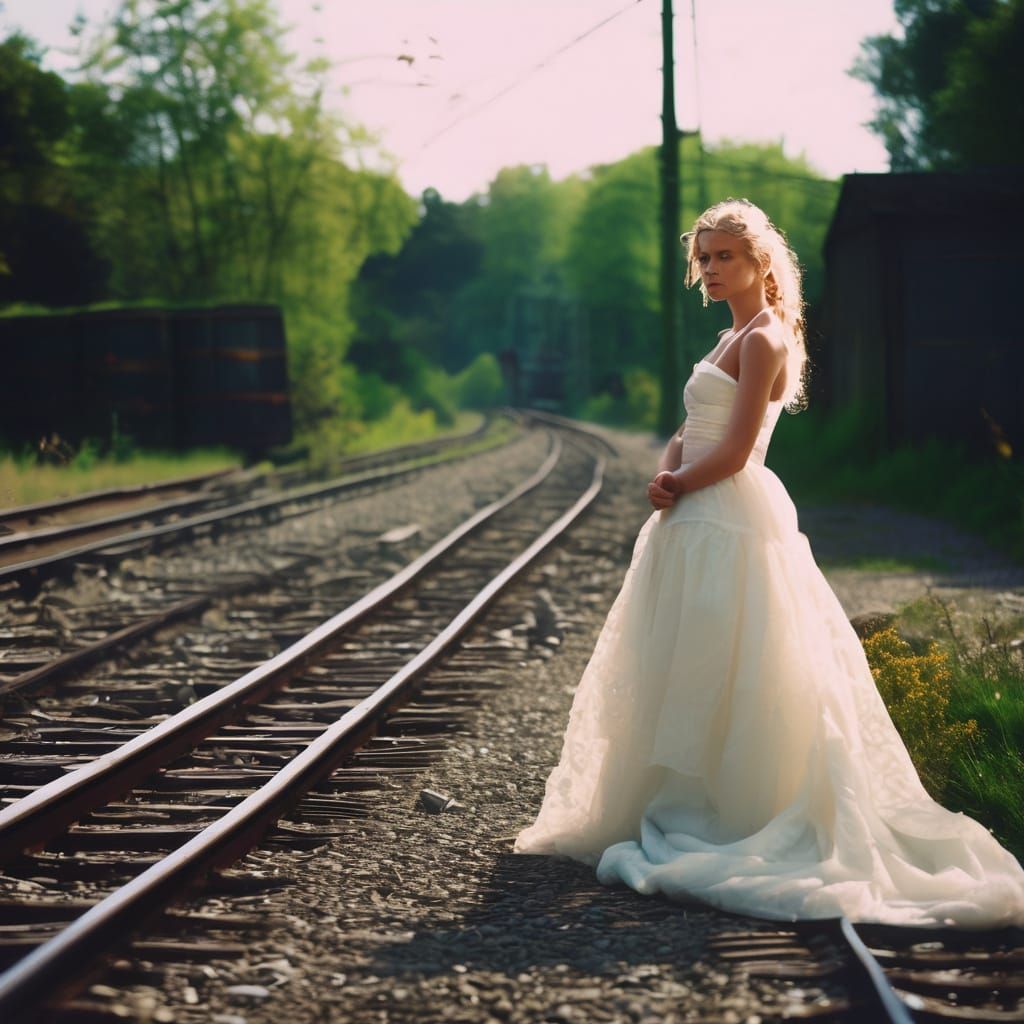 A cinematic film still captures a dramatic scene of a bride tied to train tracks, with blonde hair obscuring her face, bathed in atmospheric lighting and film grain.