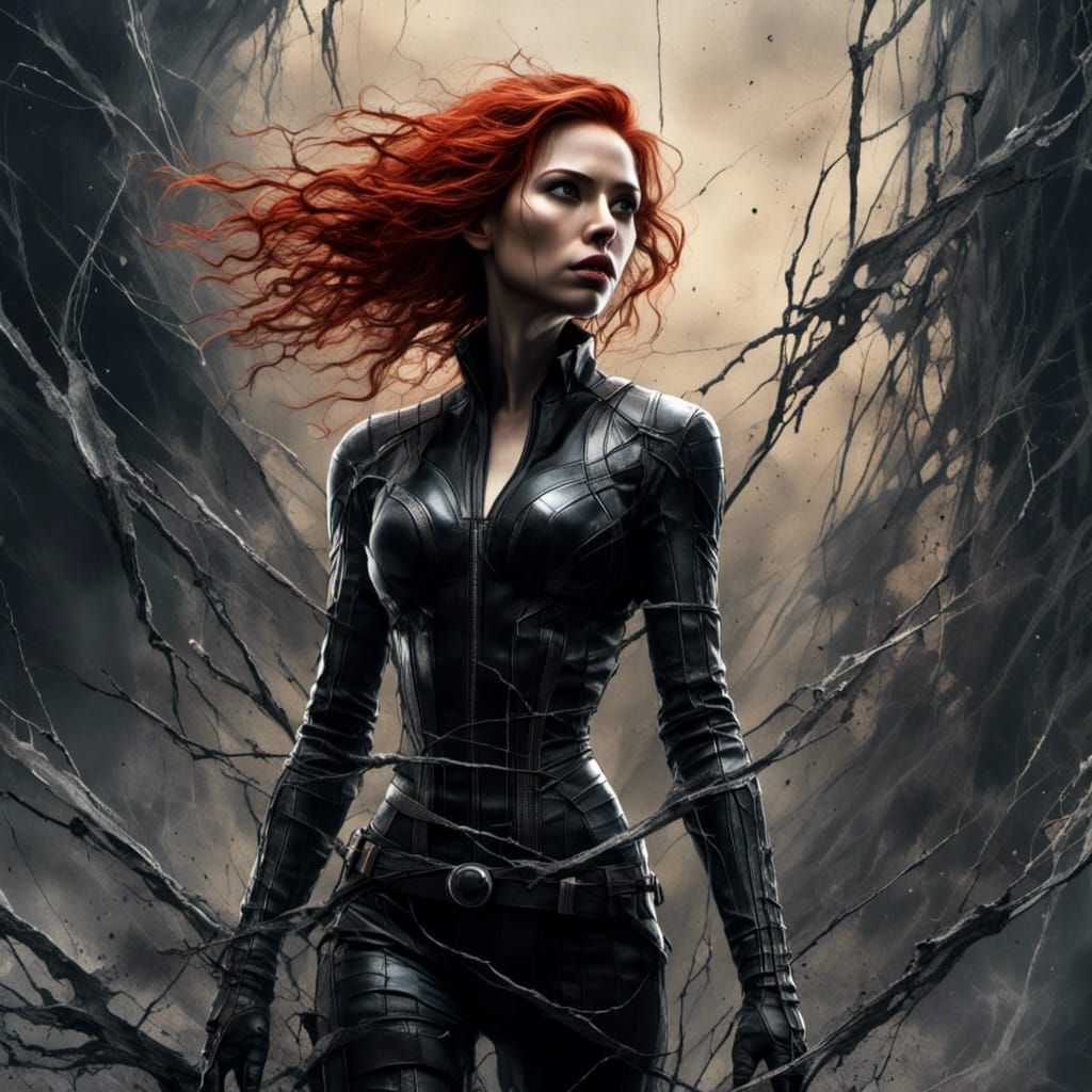 This image depicts a dystopian goth version of Scarlett Johansson as Black Widow. The full body view is rendered in a detailed 3D anime art style with ultrafine detail and breathtaking 8k resolution.