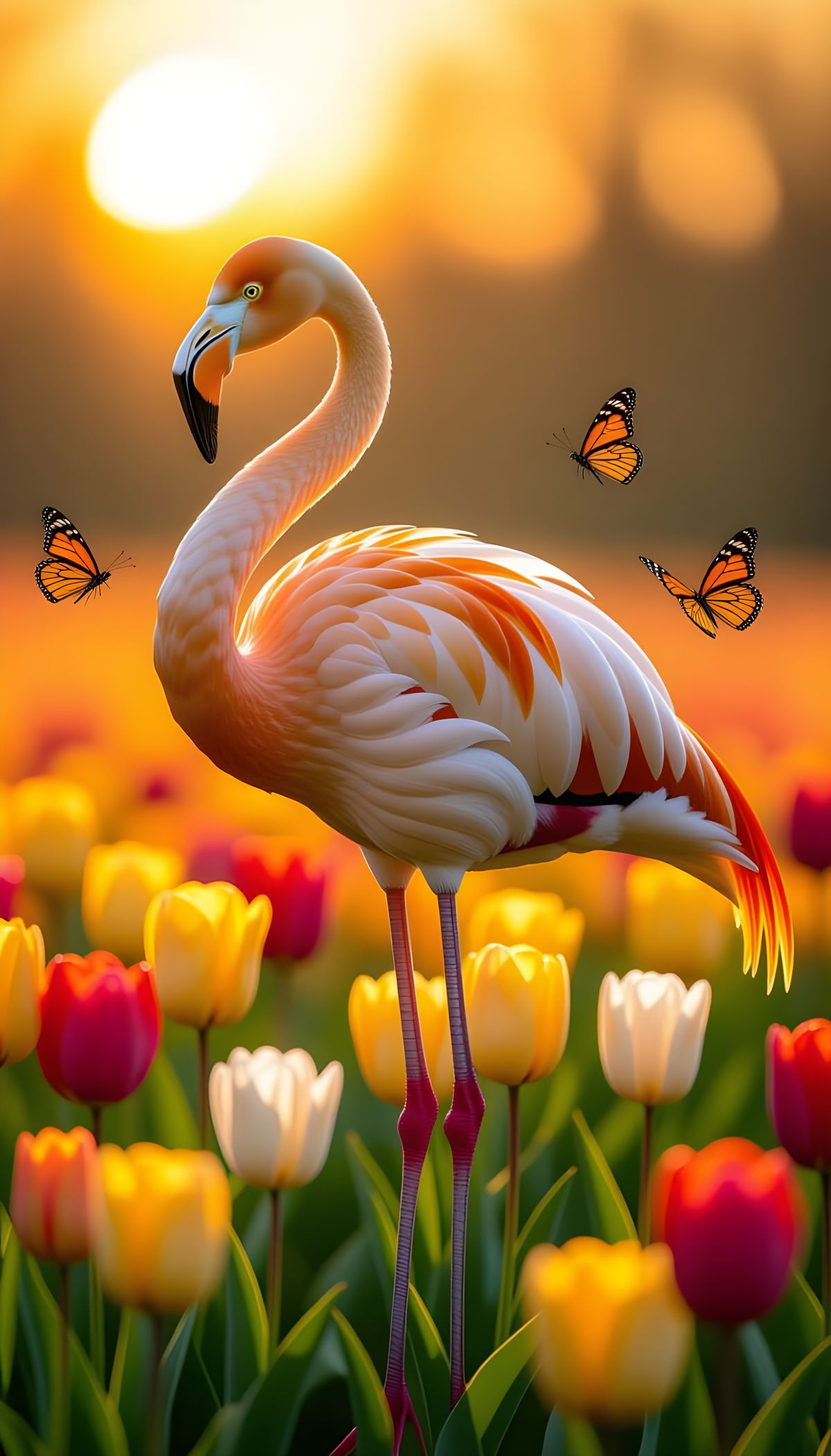 This AI-generated image features a radiant golden flamingo with silky feathers, elegantly posing in a vibrant field of tulips at dawn. The scene is bathed in warm, golden light, with butterflies adding a touch of magic.