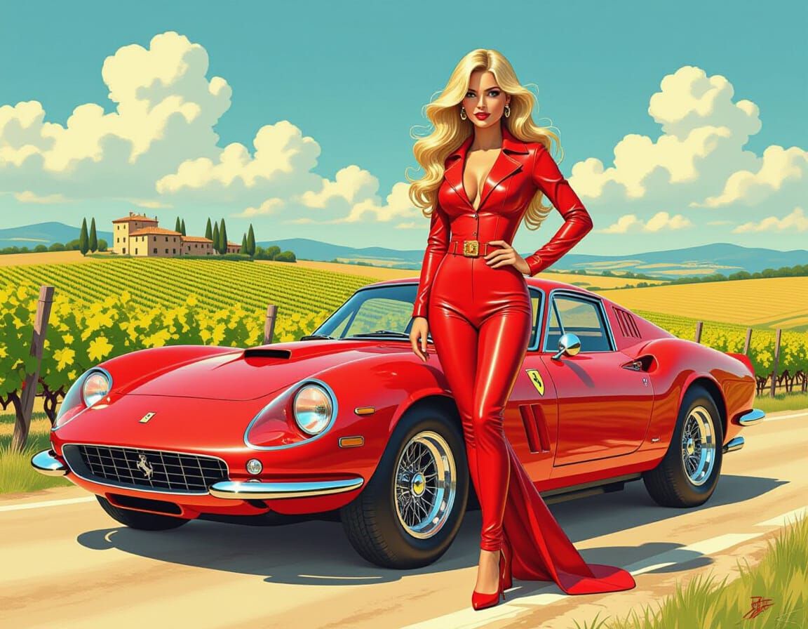 A captivating image of a blonde woman in a red catsuit standing by a vintage Ferrari. The artwork evokes classic comic book illustrations with bold lines and vibrant colors, set against a scenic Italian backdrop.