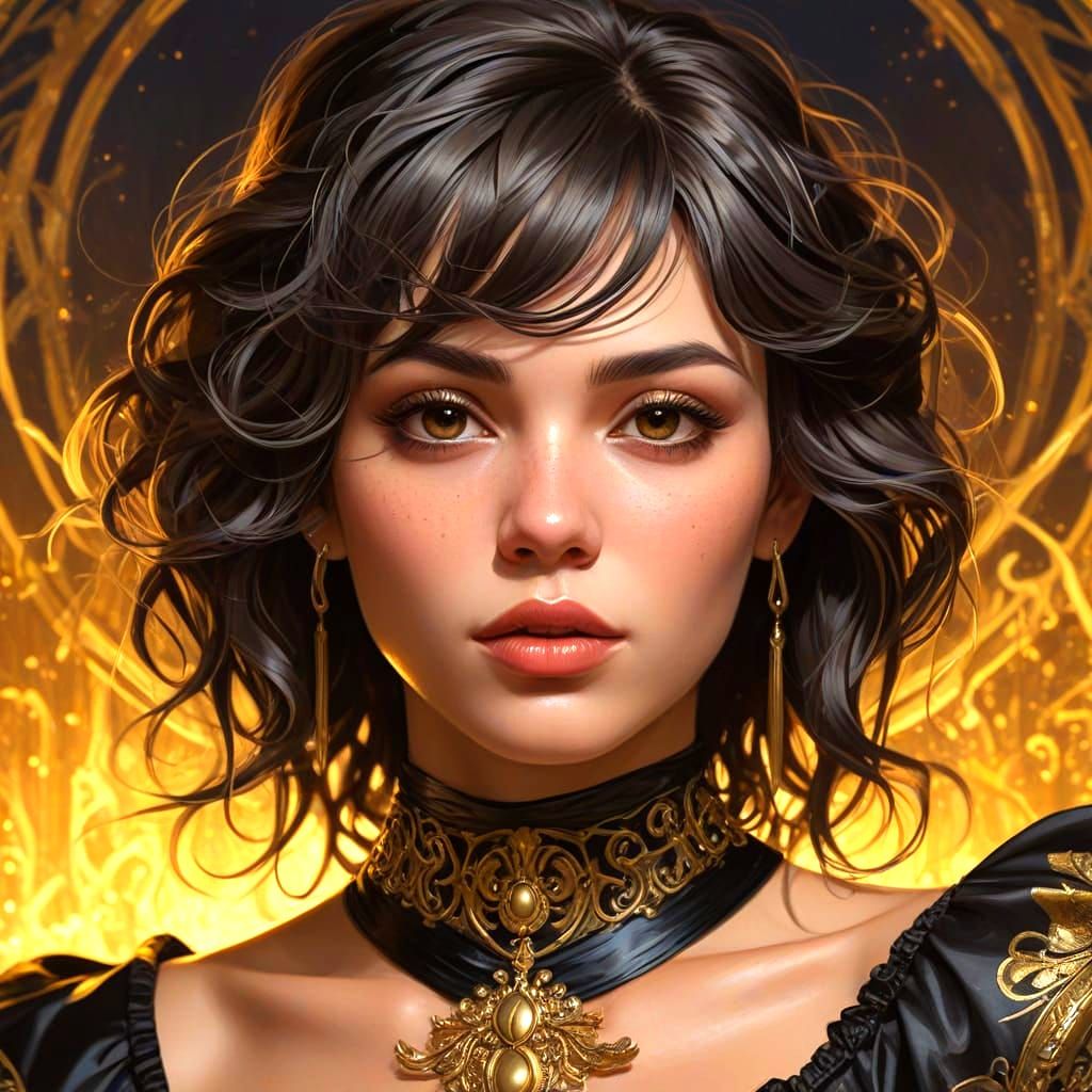 A striking picture of a beautiful redhead woman in a black and gold dress, set against a moonlit forest. This head and shoulders portrait uses dynamic lighting to capture intricate details in an impasto style.
