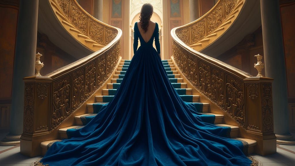 This image shows a regal woman in a deep blue velvet gown on a grand staircase, rendered with painterly realism and fantastical elements. It features dramatic lighting and rich colors, evoking a fantasy concept art style.