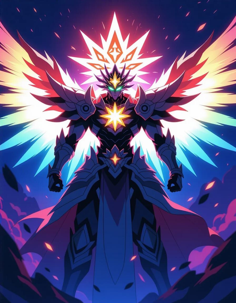 A powerful warrior with energy wings and a radiant crown, depicted in a vibrant, cel-shaded digital painting with intense lighting.