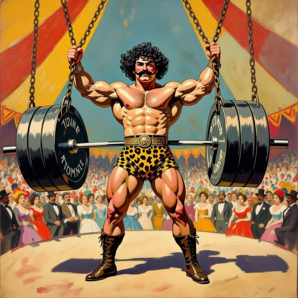 This image shows a 19th-century circus strongman in a vibrant tent. The character, with a curly mustache and leopard shorts, lifts heavy weights for an awestruck audience in a style reminiscent of impressionist art.