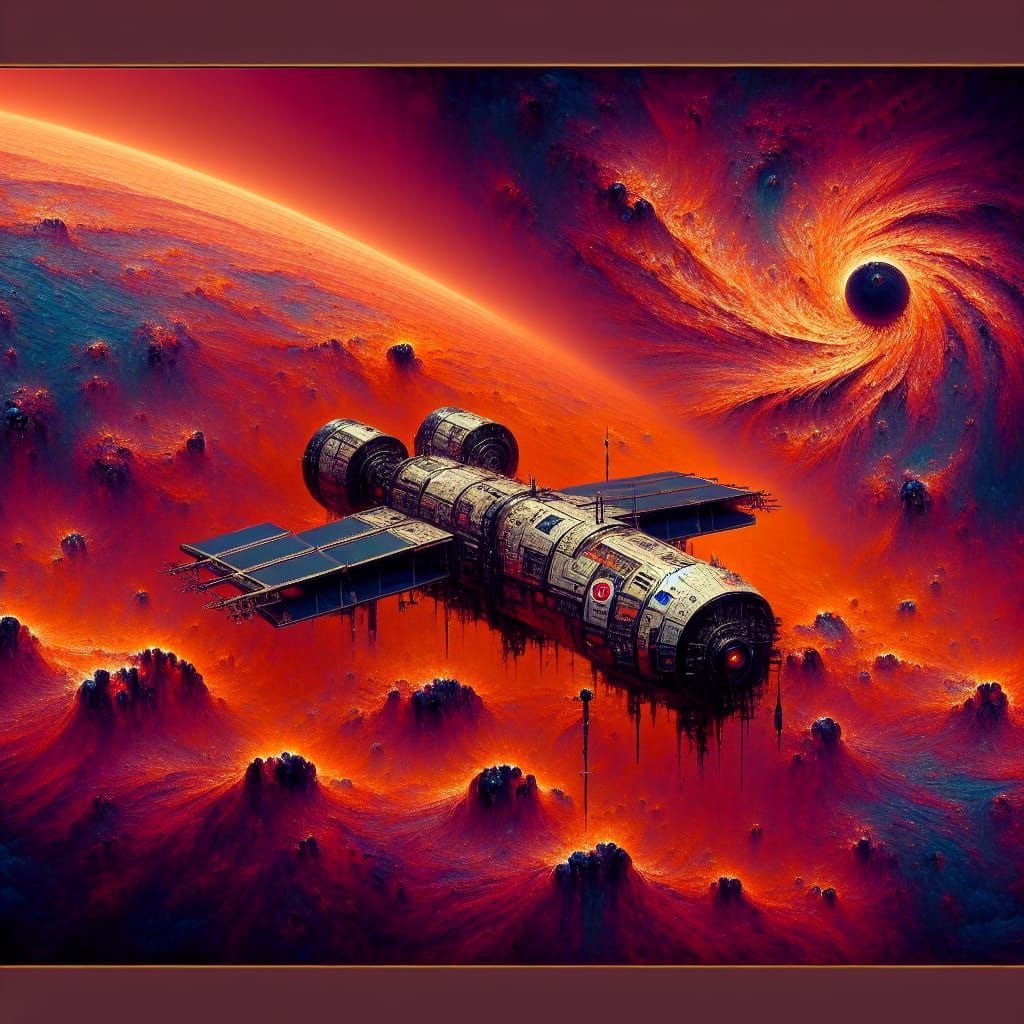 This image shows a spacecraft as it attempts to land on Venus. The planet's extreme heat causes parts of the ship to melt, emphasized by deep, complementary colors in this 8k resolution rendering.