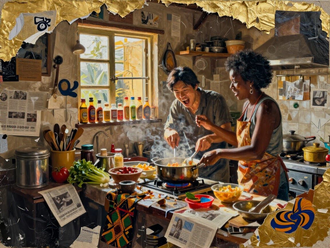 Maximalist Collage of a cluttered chaotic kitchen in Southeast Asia, an Asian Man and a Black Woman are cooking with great animation and exaggerated gestures, golden-hour sunlight streams in through a tiny window, spice bottles line the window sill, impasto-rich image with heavy brushstrokes and deep ...