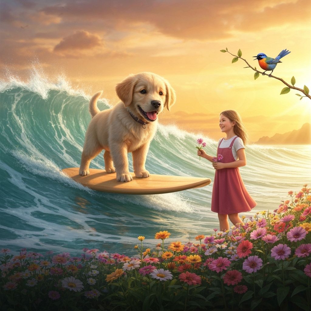 A hyperrealistic digital painting shows a happy golden retriever puppy surfing a wave at sunset. Nearby, a girl joyfully picks flowers in a serene garden with a singing bird.