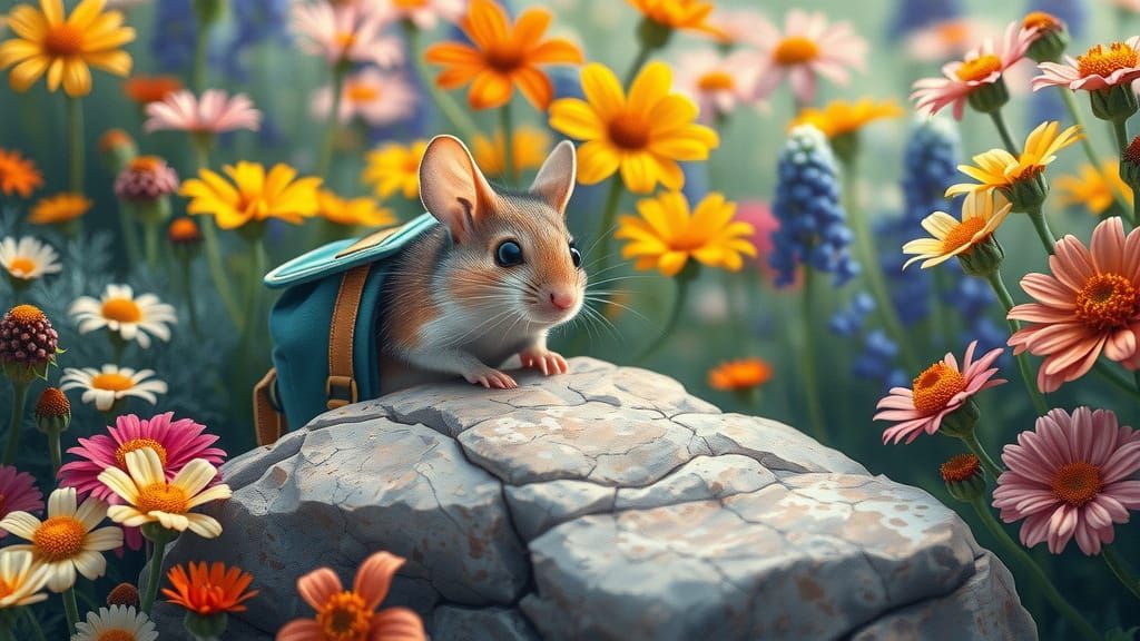 A vibrant alcohol ink image shows a shy mouse with a tiny backpack peeking over a rock in a flower garden. The colors are deeply saturated and details are intricate.
