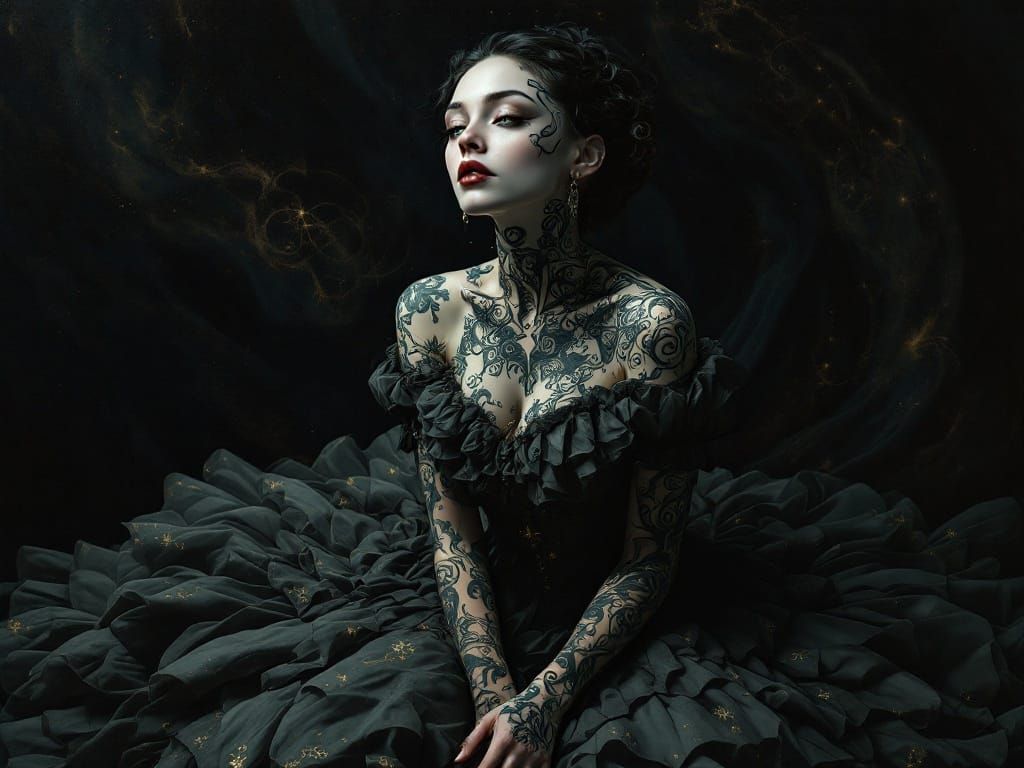 A striking portrait of a woman in a Victorian puffy dress, adorned with intricate black tattoos on her face, arms, and legs, set against a swirling black background with photorealistic shadows.
