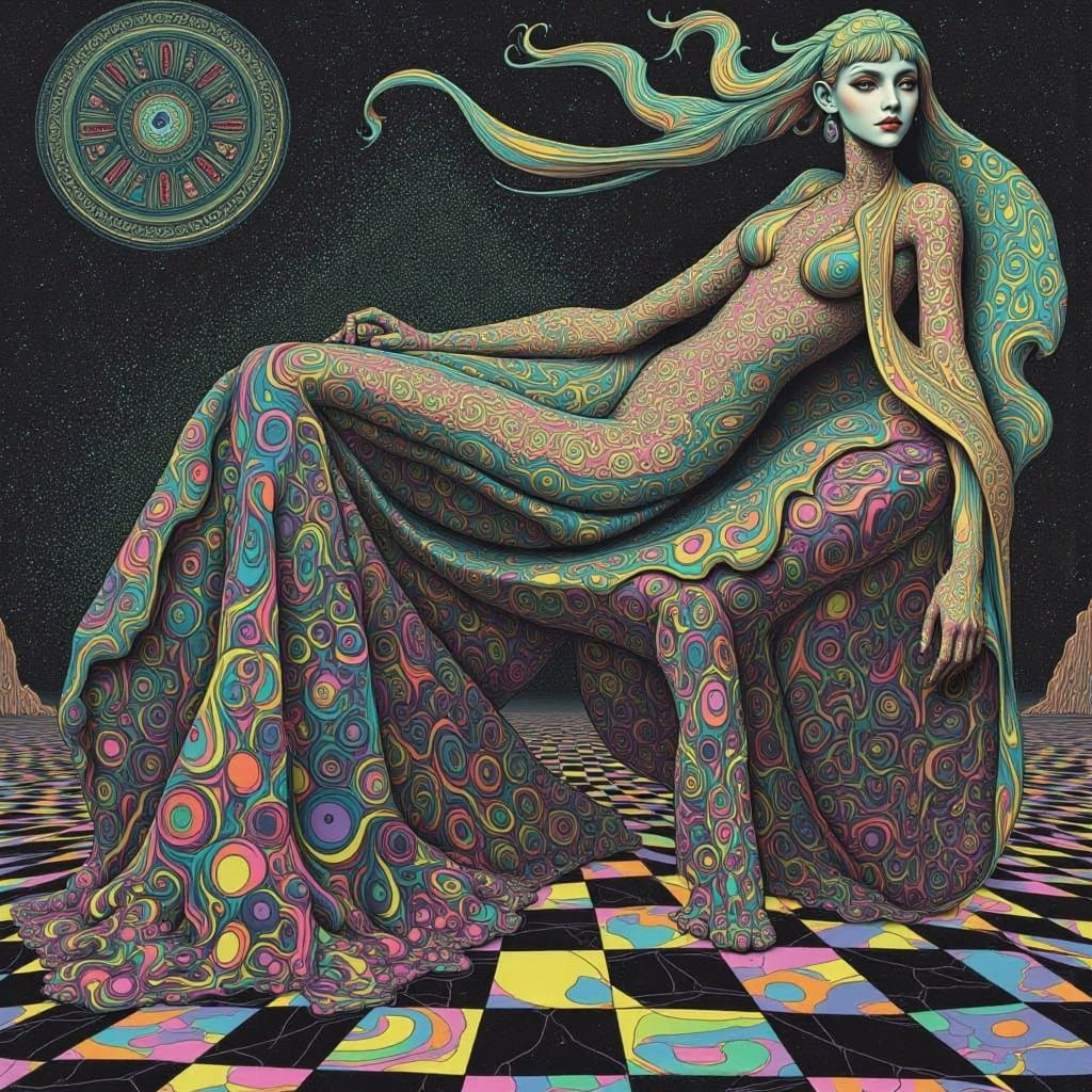 A surreal image of an alien woman in tribal attire reclining on bismuth architecture. The scene features infinite staircases and desolate landscapes, rendered in a dark surreal style.