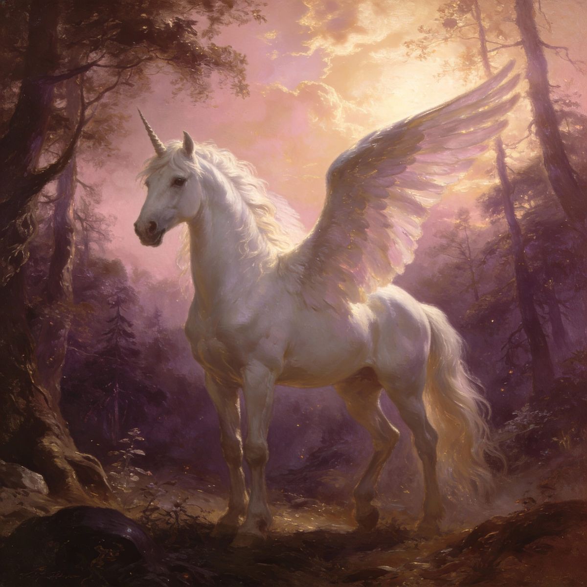 This sepia-toned image features a majestic white pegasus in a mystical forest of dusty pink and purple. The champagne skies create an ethereal glow, inspired by romantic landscape art.