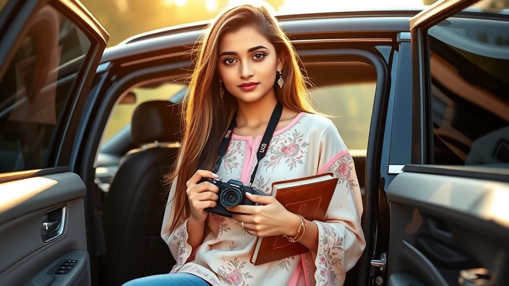 A striking picture of a young Indian woman stepping out of a luxury car. She has a DSLR camera and diary, bathed in soft, dreamy light reminiscent of classical portraiture.