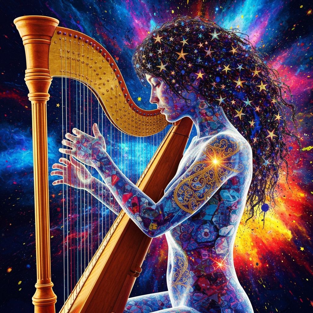 This image shows a surreal harpist with a translucent, bioluminescent body interwoven with stars, set against a vibrant, swirling background of blues, purples, and reds. It features intricate golden filigree and a dreamy, alchemical aesthetic.