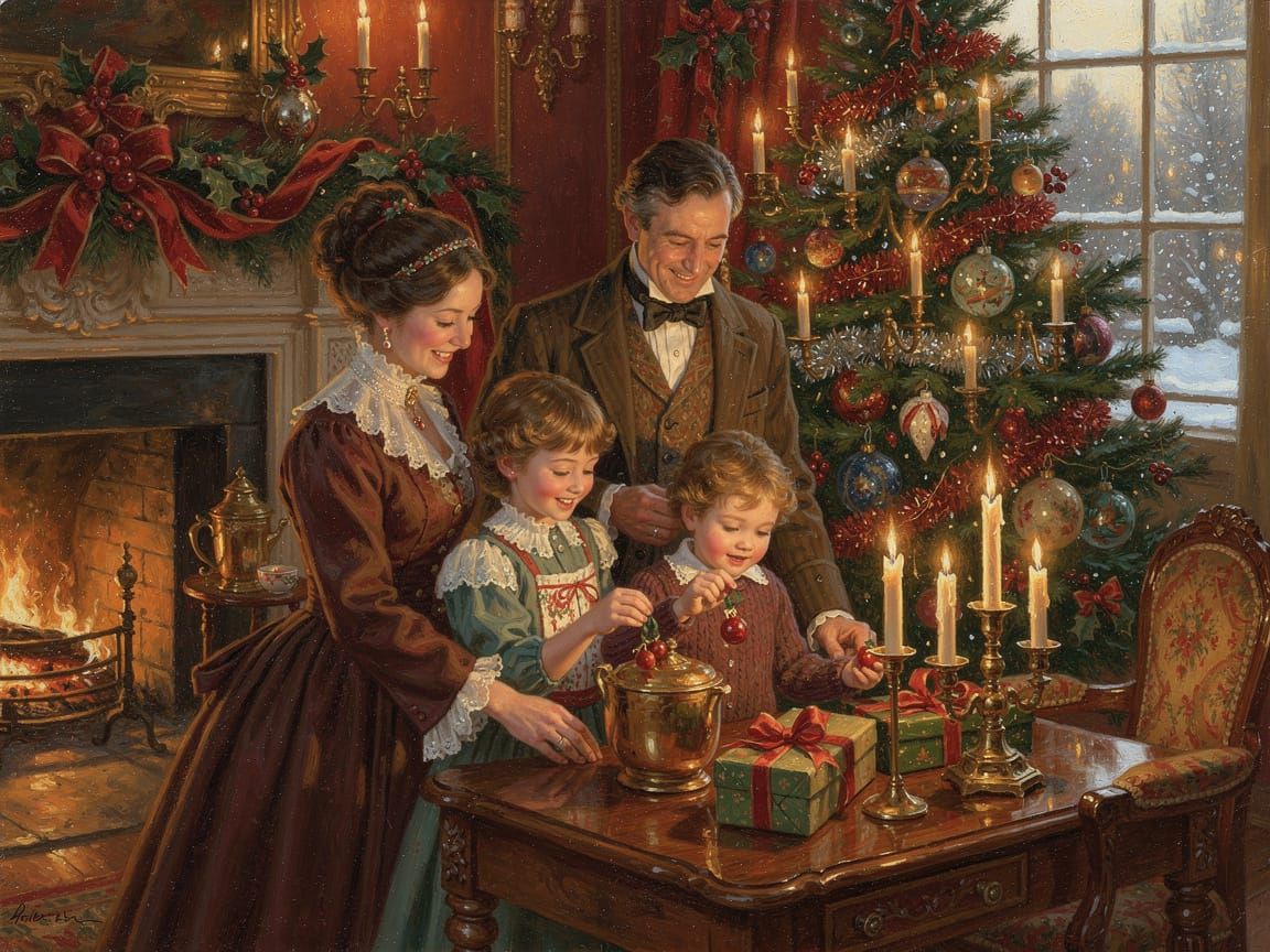 This image captures a cozy Victorian Christmas scene with warm candlelight, garlands, and a decorated tree. Rendered with rich, impasto brushstrokes and a festive color palette, it evokes a nostalgic holiday atmosphere.