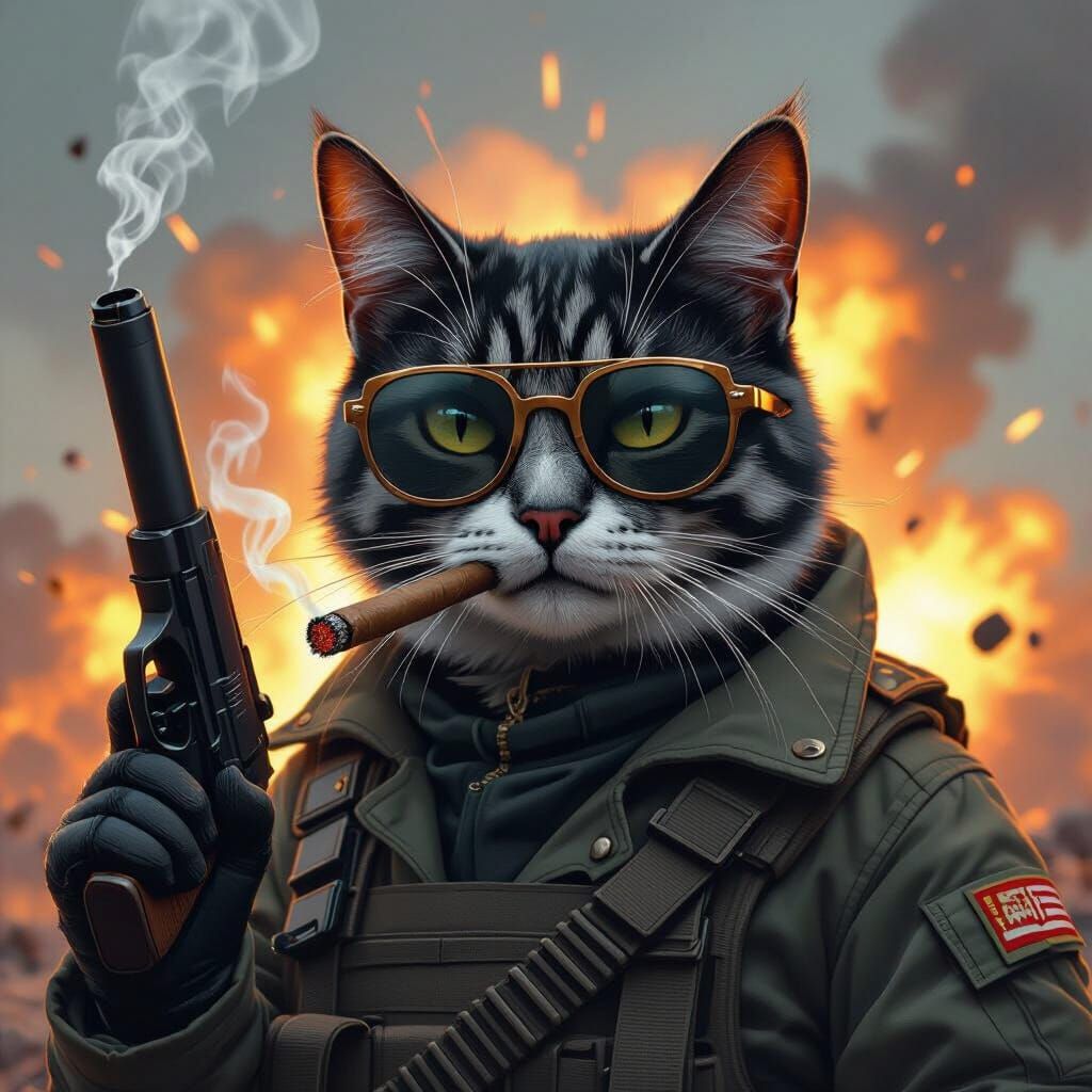 This image shows a cat with black and grey fur in a military style, smoking a cigar and holding a gun. The background features a dramatic explosion, rendered in a gritty, futuristic style.