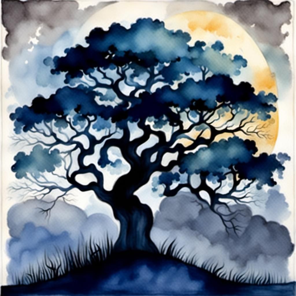 This image shows trees in silhouette under moonlight. The watercolor painting evokes a feeling of sorrow and grief through its muted tones and ethereal composition.