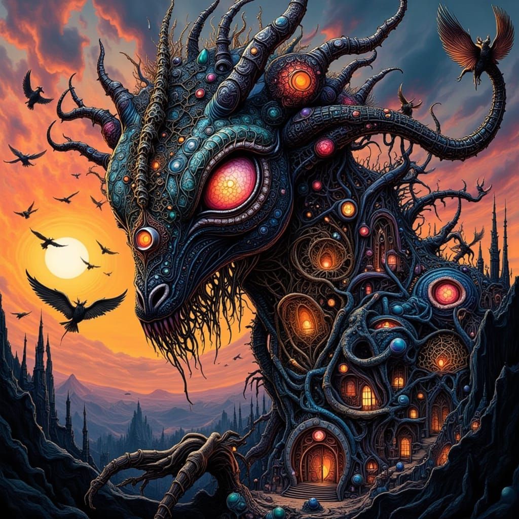 A digital rendering of a bizarre creature silhouetted against a cityscape at sunset. The image features intricate architectural forms, whimsical tree-like figures, and a flock of birds, rendered in a futuristic, polygonal style.