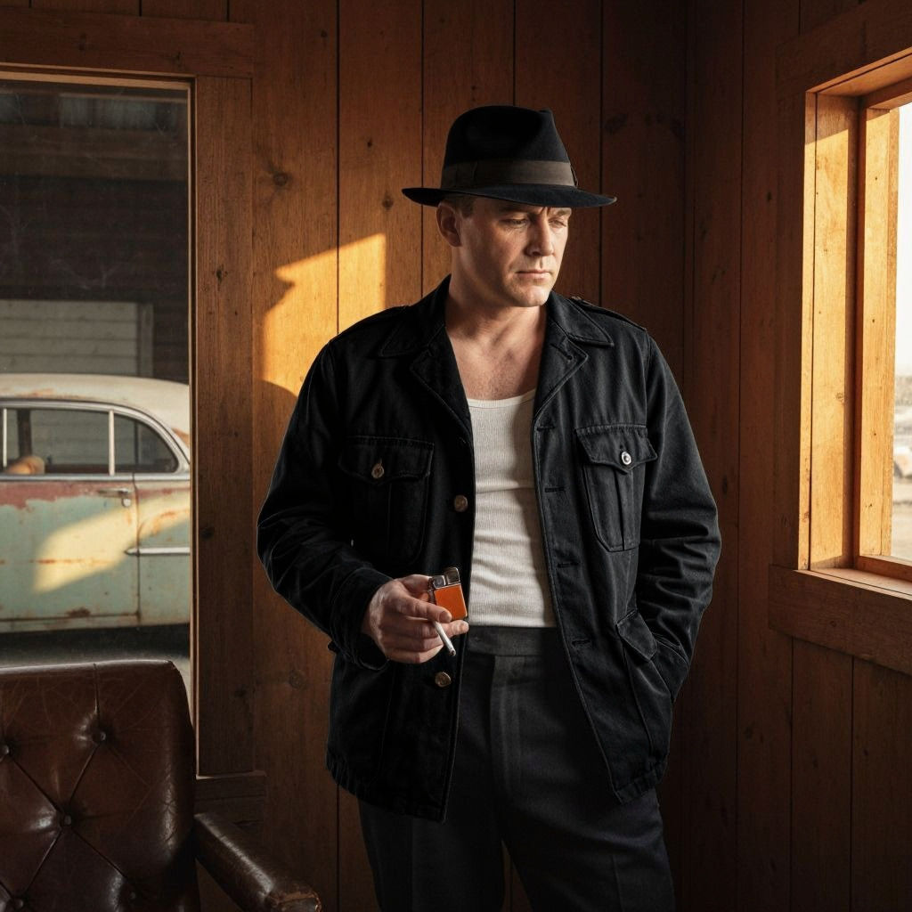 This image shows an American military veteran in a 1950s suit lighting a cigarette. The scene includes a period car and a masculine office with a wooden design, all rendered in a realistic style.