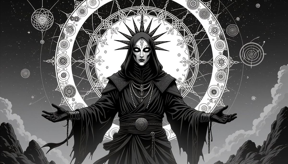 This image shows a mystical deity formed from photographic psychic energy, dressed in ragged clothing. Wormholes and chaos sigils surround the figure in a dark comic book style, with anime-inspired details and intricate concept art.