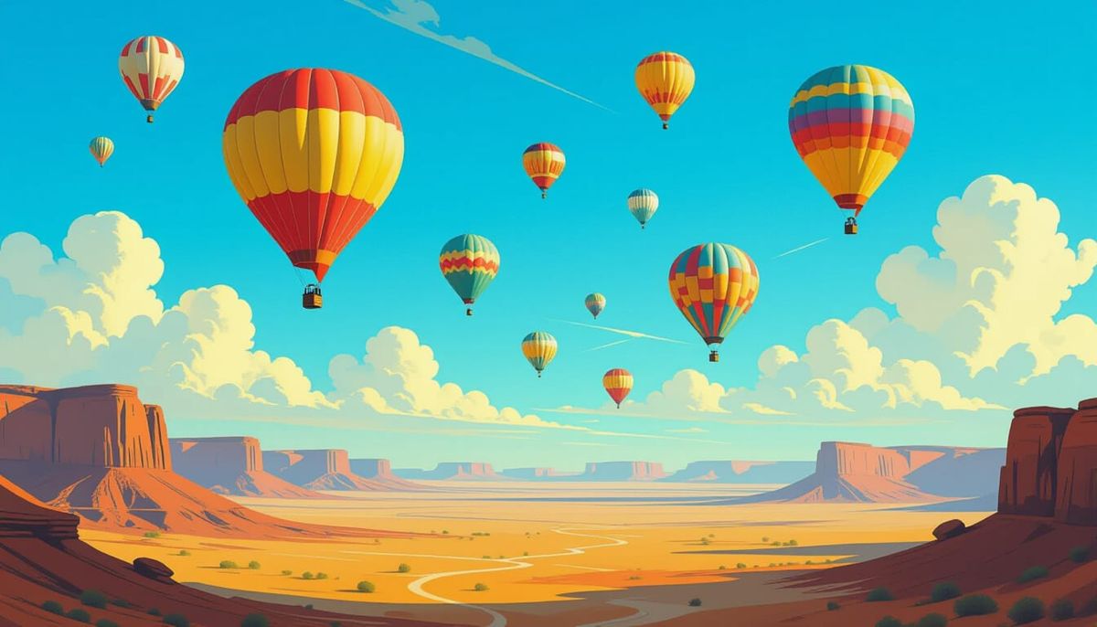 This image depicts a surreal scene of many colorful hot air balloons floating in a clear blue sky above a vast desert. The artwork features intricate textures and ethereal lighting, evoking a dreamlike quality.